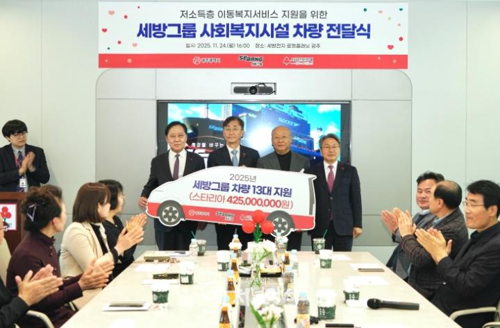 전달식은 세방그룹이 지난 1월 광주사회복지공동모금회에 기탁한 5억원의 성금을 바탕으로 마련했다. 기부금은 사회복지시설 등 13개 기관에 현대차 ‘스타리아’ 차량 13대를 지원하는 데 활용된다. 또 지역복지관 프로그램 운영, 취약계층 지원 등 다양한 복지사업에도 폭넓게 쓰일 예정이다.