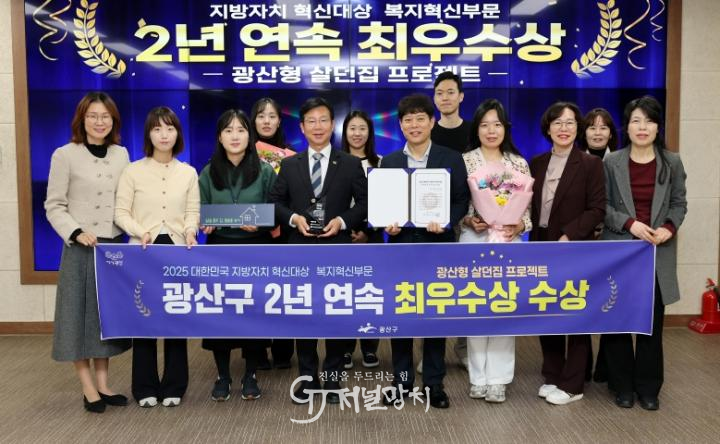 ![]() 광산구가 ‘2025 대한민국 지방자치 혁신대상’에서 2년 연속 최우수상을 받았다. 이 상으로 광산구 ‘살던집 프로젝트’는 복지 혁신 평가 2관왕을 기록하게 됐다. /광주 광산구 제공 |