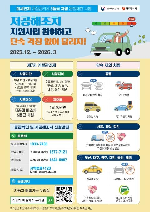 광주시는 지난 2021년부터 고농도 초미세먼지 발생이 예측될 경우 5등급 차량 운행 제한을 시행해왔으며, 제5차 계절관리기간부터 예방적 조치 차원에서 이를 상시 시행했다.