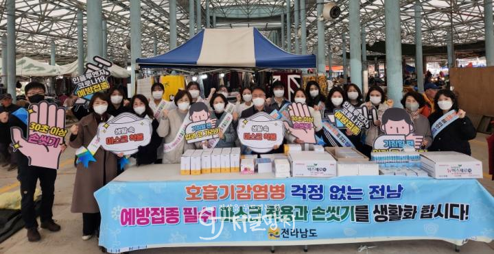 이에 전남도와 무안군보건소 등 50여 명은 26일 일로시장 일원에서 시장 방문객을 대상으로 예방접종 독려와 마스크 등 예방 물품을 나눠주며 독감 확산 방지 캠페인을 벌였다. 특히 예방접종 독려, 호흡기감염병 예방수칙, 의료기관과 마트, 학원 등 다중이용시설 방문 시 마스크 착용을 적극 홍보했다.