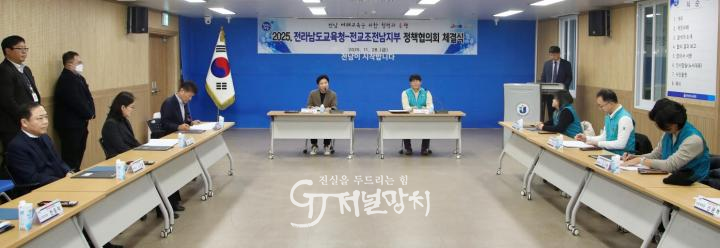 ![]() 28일 전라남도교육청 중회의실에서 ‘2025년 정책협의회 체결식’이 진행되고 있다. /전라남도교육청 제공 |