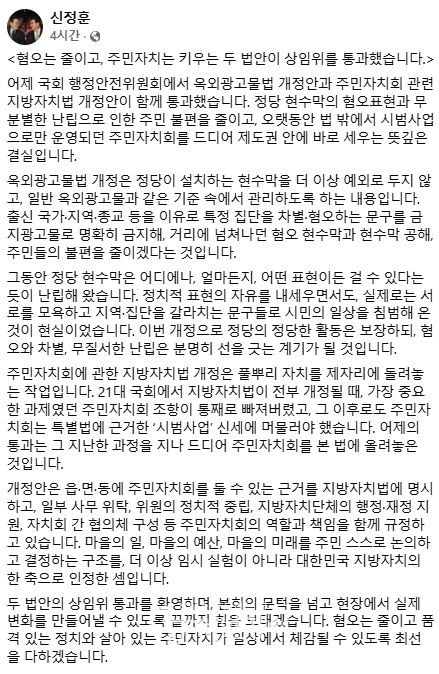 신정훈 의원은 28일 자신의 페이스북을 통해 “어제 국회 행정안전위원회에서 옥외광고물법 개정안과 주민자치회 관련 지방자치법 개정안이 함께 통과했다.”며 “정당 현수막의 혐오표현과 무분별한 난립으로 인한 주민 불편을 줄이고, 오랫동안 법 밖에서 시범사업으로만 운영되던 주민자치회를 드디어 제도권 안에 바로 세우는 뜻깊은 결실이다.”고 밝혔다.