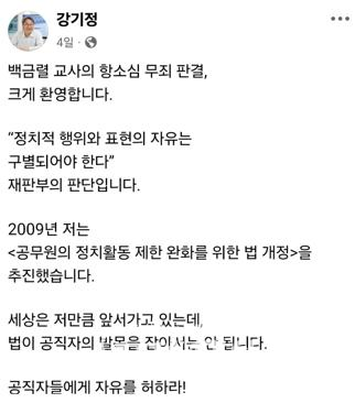 이에 대해 강기정 광주시장은 26일 자신의 페이스북을 통해 “백금렬 교사의 항소심 무죄 판결, 크게 환영한다.”고 밝혔다.