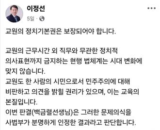 이정선 광주시교육감 또한 자신의 페이스북을 통해 “교원의 정치기본권은 보장돼야 한다.”고 밝혔다.