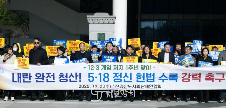 ![]() 김영록 전라남도지사가 3일 도청 표지석 앞에서 사회단체 연합회 소속 회장 및 회원들과 ‘12·3 계엄 저지 1주년을 맞아 내란 청산 및 5·18 정신 헌법 수록을 촉구하는 결의를 하고 있다. /전라남도 제공 |