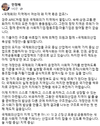 민형배 의원은 4일 자신의 SNS를 통해 “경주 APEC처럼 많은 국제회의가 지역에서 열린다. 숙박·상권·교통·문화까지 지역의 모든 자원이 총동원된다.”며 “그런데 정작 지역은 주체가 아니고, 함께 준비해 온 사회적기업·협동조합·마을기업은 참여할 문이 없다.”고 밝혔다.