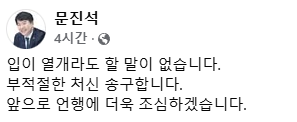 한편 문 의원은 4일 자신의 SNS에 “입이 열개라도 할 말이 없다. 부적절한 처신 송구하다.”며 “앞으로 언행에 더욱 조심하겠다.”고 관련 사실에 대한 입장을 밝혔다.