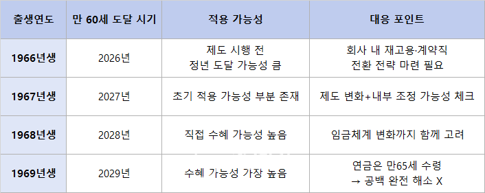 ![]() 출생연도별 정년(만 60세) 도달 시기와 정년 연장 제도 적용 가능성 |