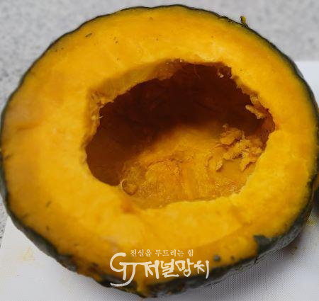 썰어놓은 채소를 5분 정도 졸여 국물이 없어지면 단호박 속에 넣어 5분만 찐 다음 먹기 좋게 8조각으로 썰어 먹으면 된다.