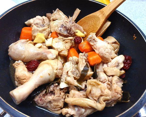 마늘과 대파, 생강은 다져서 진간장과 맛술, 참기름, 후추가루, 참깨를 넣어 양념장을 만들어 준비하고, 웍에 식용유와 참기름을 넣고 건고추를 채로 썬 다음 고추기름을 낸다. 그리고 배즙과 맛술, 다시마, 닭고기를 넣은 다음 만들어 놓은 양념장의 2/3를 넣고 10분간 끓인다.