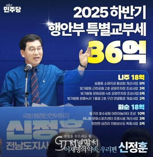 한편 신정훈 의원은 22대 국회 들어 현재까지 행정안전부 특별교부세 총 175억 원을 확보하며, 나주·화순 지역의 생활 SOC 확충과 주민 불편 해소를 위한 주요 현안 사업들을 꾸준히 챙기고 있다.