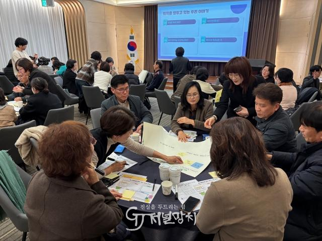 ![]() 퇴직 예정 교직원들이 사회참여 지원 연수 중 테이블 토론에 참여하여 퇴직 후 봉사활동 분야에 대한 토론을 하고 있다. /전라남도교육청 제공 |
