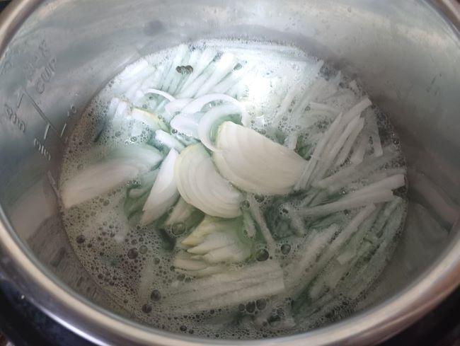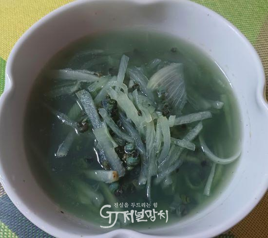 이제 다슬기국을 끓일 차례다. 무와 양파는 채로 썰고 마늘은 다진다. 솥에 다슬기 국물을 붓고 양파채, 다진 마늘을 넣어 끊이고 소금으로 간을 맞춘다. 그릇에 담아 부추가 있으면 약간 썰어 올리면 된다.