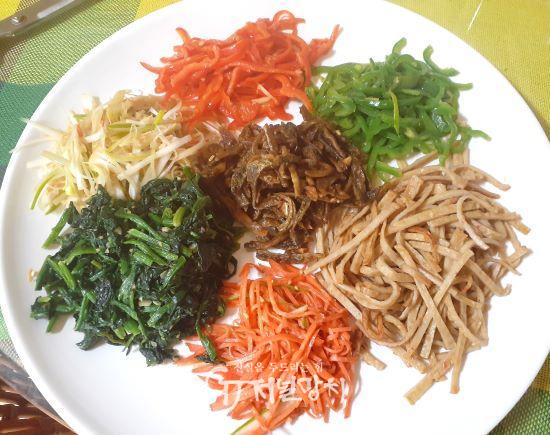 파프리카를 깨끗이 씻어 색깔 별로 가늘게 채를 썬다. 시금치는 데쳐 소금과 다진 마늘, 참기름을 넣고 무친다.