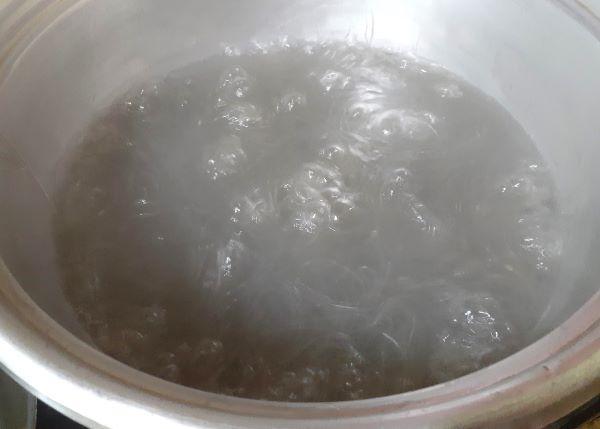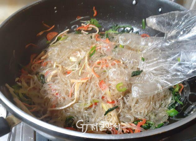 솥에 당면을 넣고 20분 정도 끓이고 찬물에 씻는다. 전분기가 빠지게 찬물에 잘 씻으면 면을 더 쫄깃하게 해 준다. 물기를 뺀 당면을 간장과 설탕, 다진 마늘을 넣고 버무린 후 참기름을 넉넉히 넣어 볶는다. 면이 빡빡해지면 참기름을 넣으면 된다.