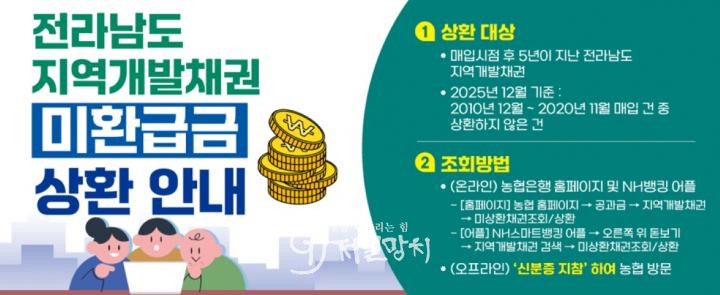 윤진호 전남도 기획조정실장은 “일제상환 기간 운영을 통해 지역개발채권 미환급금을 최소화해 도민의 정당한 권리를 보호하겠다.”고 말했다.