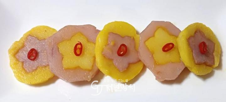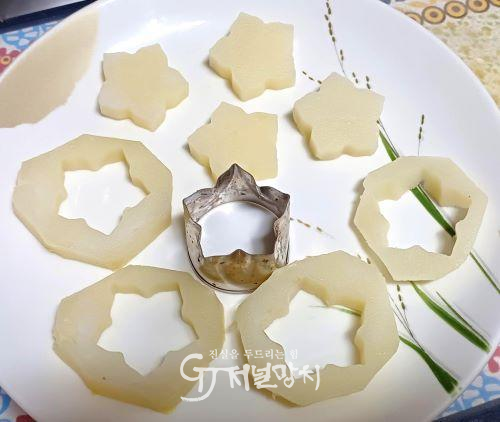 먼저 감자를 깨끗하게 씻어 찜기에 찌고 식힌다. 그런 다음 껍질을 벗겨 1cm 두께로 썬다. 비트를 채로 썰어 물에 담가 비트물을 만들고 치자를 담가 치자물을 만든다. 겉은 치자물 속에, 꽃모양은 비트물에 10분 정도 담가 색을 낸다.