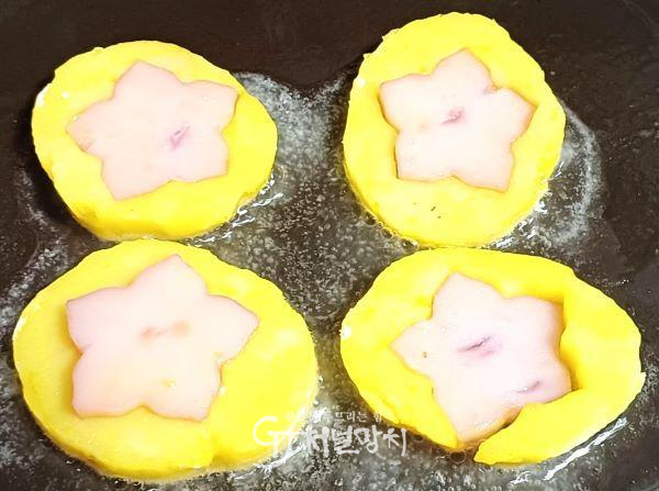 색을 낸 감자를 키친타올 위에 건져 오려낸 감자 속에 다시 끼우고, 달걀에 다진 마늘과 참치액젓으로 간을 맞춘다. 그런 다음 감자 아랫부분만 밀가루를 묻히고 달걀을 묻혀 펜에 식용유를 두르고 지지면 된다.