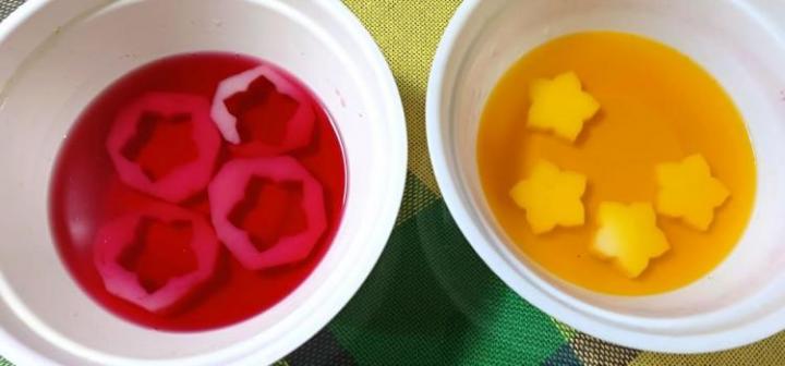 ![]() 치자물과 비트물에 담가 색을 내는 모습 |