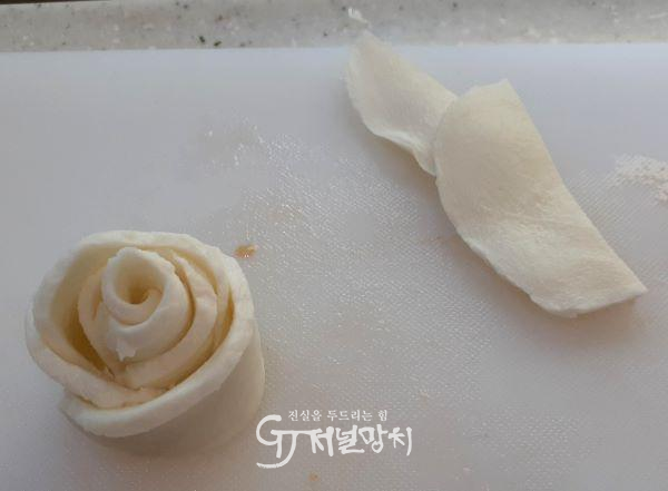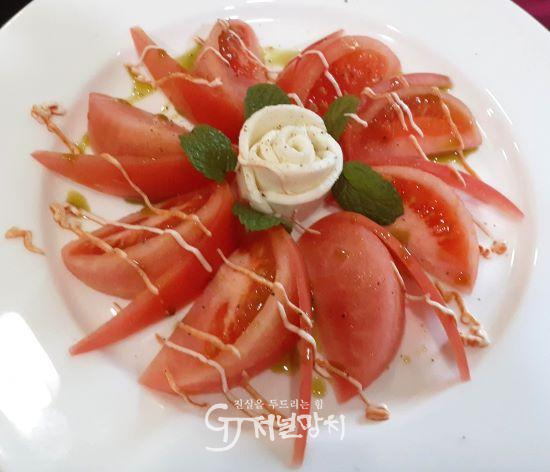 치즈는 얇게 썰어 말아서 끝을 펴고 돌려놓은 토마토 가운데에 놓는다. 치즈 꽃과 토마토 사이에 허브 잎으로 장식하면 된다. 마요네즈를 비닐봉투에 넣어 가위로 끝을 미세하게 잘라 묶어서 손으로 누르면서 위에 뿌리면 완성이다.