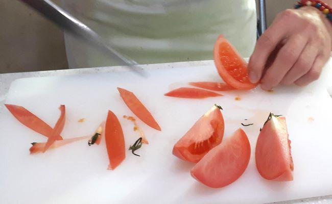 먼저 토마토를 깨끗이 씻어서 물기를 닦아 8등분으로 나누어 자른다. 카빙 칼이나 과일 칼 등 얇은 칼을 이용해서 껍질을 포를 뜨고 끝은 남겨둔다. 접시에 껍질과 속살이 나누어진 부분을 접시 바깥 부분에 둘러서 놓는다.