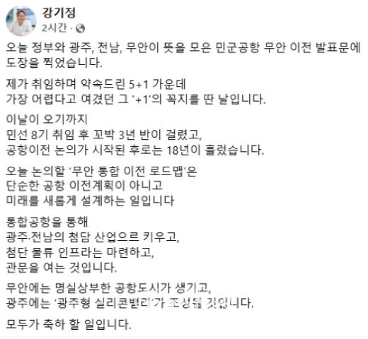 강 시장은 이날 자신의 페이스북을 통해 “오늘 정부와 광주, 전남, 무안이 뜻을 모은 민군공항 무안 이전 발표문에 도장을 찍었다. 취임하며 약속드린 5+1 가운데 가장 어렵다고 여겼던 그 '+1'의 꼭지를 딴 날이다.”며 “이날이 오기까지 민선 8기 취임 후 꼬박 3년 반이 걸렸고, 공항 이전 논의가 시작된 후로는 18년이 흘렀다.”고 전했다.