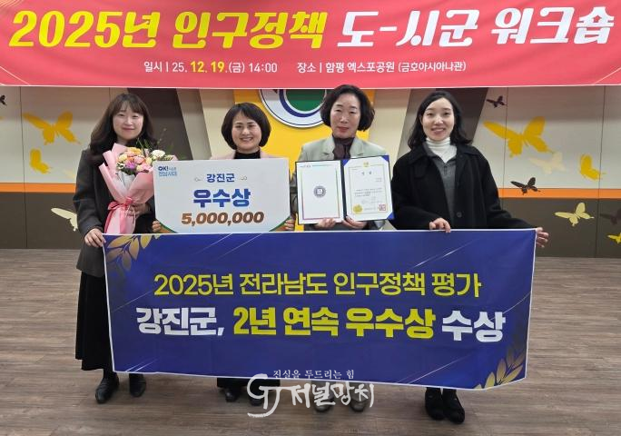![]() 강진군이 전남도가 실시한 2025년 인구정책 우수 시·군 평가에서 우수상을 받았다. /강진군 제공 |