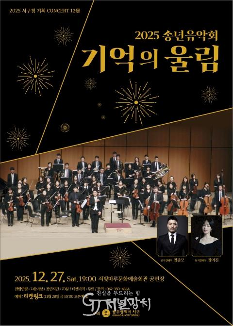 이번 음악회는 ‘격동의 2025년, 기억을 품고 되새기는 연대의 울림’을 주제로 ‘착한도시 서구’ 조성을 위해 한 해 동안 함께해 온 주민들에게 감사의 마음을 전하고 민주주의의 가치와 연대의 의미를 되새기기 위해 마련됐다. 정통 오케스트라와 국내 정상급 뮤지컬 배우, 성악가의 협연으로 깊이 있는 무대를 선보일 예정이다.