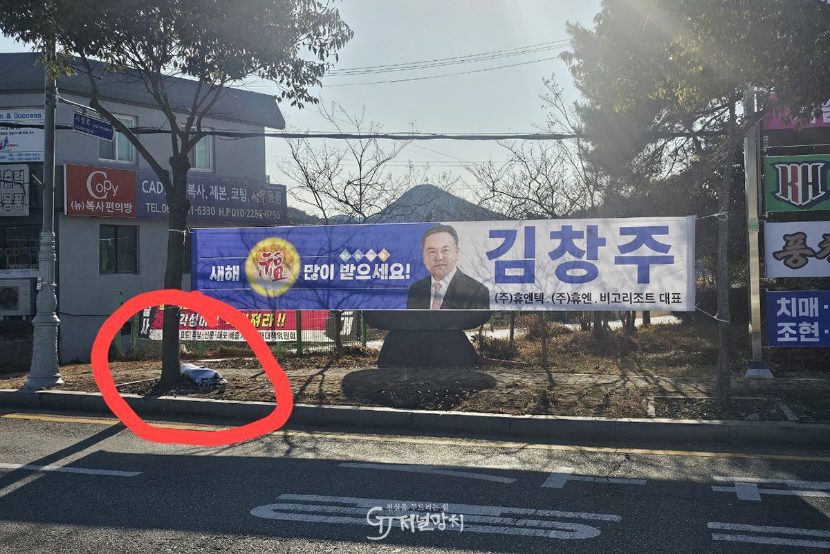 ![]() ▲ 훼손돼 도로변에 방치된 신정훈 의원의 새해인사 현수막. |
