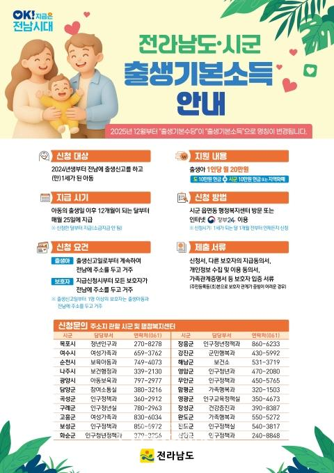전남도는 2025년 11월 기본사회 흐름을 반영해 ‘전라남도 출생기본소득 지급에 관한 조례’를 개정하고, 제도 명칭을 출생기본수당에서 출생기본소득으로 변경했다.