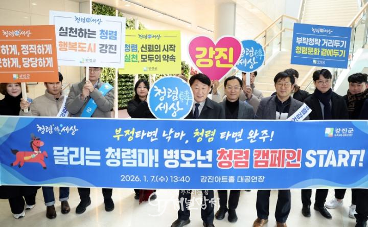 이번 청렴캠페인은 지난 7일 ‘2026년 시무식 및 Connect 강진 선포식’ 행사 속에서 함께 진행됐으며 강진원 군수를 비롯한 공직자들이 청렴 실천 의지를 다지는 뜻깊은 자리로 마련됐다. 강진군은 이번 캠페인을 통해 공직자의 기본 가치인 공정·투명·책임 행정을 강화하고 군민이 체감하는 신뢰 행정을 실현해 나갈 계획이다.