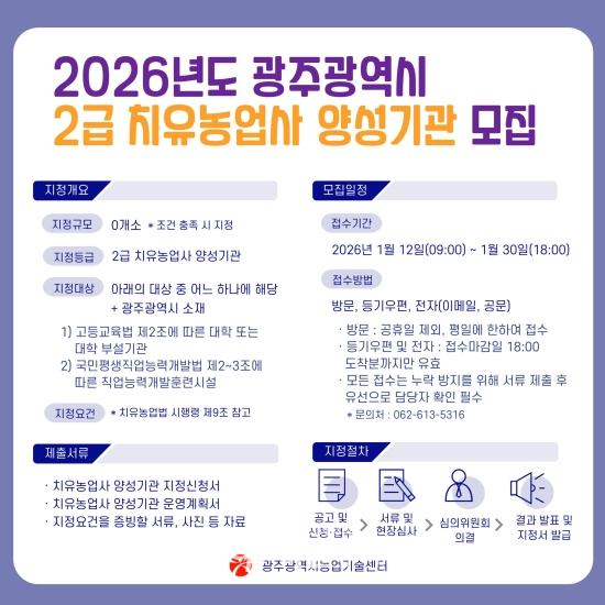 신청은 지정신청서·운영계획서 등 필요 서류를 준비해 농업기술센터를 방문하거나 등기우편(광산구 평동로 639-22, 치유농업팀), 온라인(전자우편 nancmj90@korea.kr, 공문)으로 하면 된다.