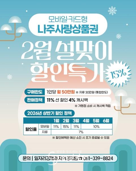 특히 2월에는 설 명절 소비 활성화를 위해 모바일 및 카드형 나주사랑상품권을 대상으로 15% 특별 할인 판매를 추진한다.