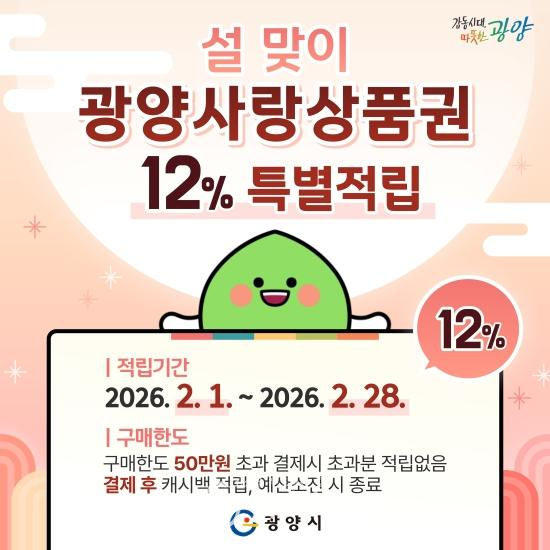 광양시 관계자는 “이번 광양사랑상품권 특별 캐시백 상향이 설 명절 소비 촉진의 마중물 역할을 하길 기대한다. 광양사랑상품권 활성화를 통해 새해에는 시민과 소상공인이 모두 함께 도약하는 한 해가 되길 바란다.”고 말했다.