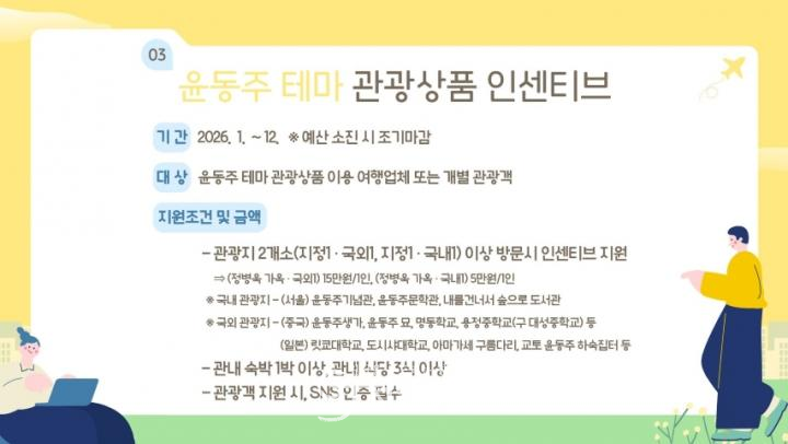 지원 대상은 윤동주 테마 관광상품을 이용하는 여행업체와 개별 관광객으로, 여행업체는 「관광진흥법」에 따른 등록 여행업체여야 한다. 개별 관광객은 관외 거주자 1인 인상으로 구성된 팀이어야 하며, 팀 대표자는 만 18세 이상이어야 하고 구성원 전원이 관외 거주자여야 한다. 동일한 여행에 대해 여행업체와 개별 관광객 간 중복 지원은 불가하다.