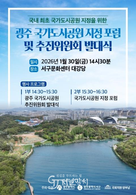 광주광역시(시장 강기정)는 서구, 양부남 국회의원실과 공동으로 오는 30일 오후 2시30분 서구문화센터 대강당에서 ‘광주 국가도시공원 추진위원회 발대식’과 함께 ‘국가도시공원 지정 포럼’을 개최한다.