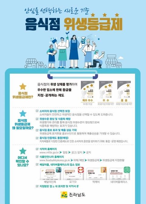 음식점 위생등급제 참여 확대를 위해 800개소를 대상으로 위생용품 지원과 환경정비 비용도 지원한다. 특히 전남도 대표 음식점인 남도음식명가를 중심으로 종사자용 친절 유니폼(앞치마·위생모) 1만 7천 세트를 지원한다.