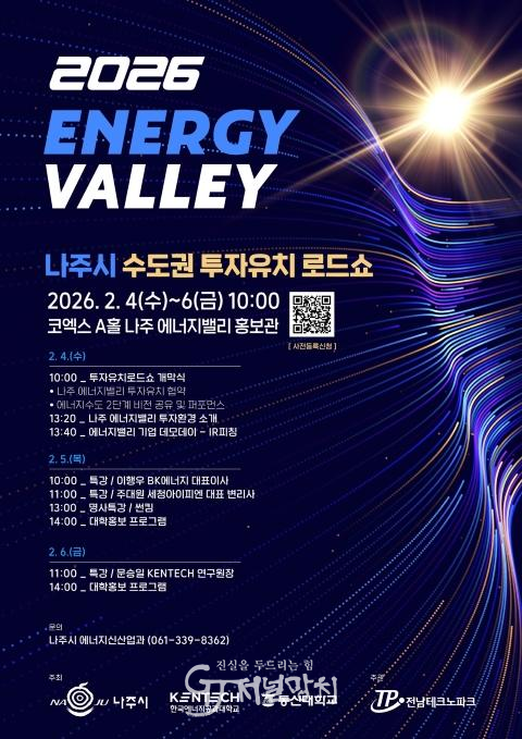 나주시는 오는 2월 4일부터 6일까지 3일간 서울 코엑스에서 ‘2026년 수도권 투자유치 로드쇼’를 열고 에너지 기업 유치 및 투자 활성화에 나선다고 29일 밝혔다.
