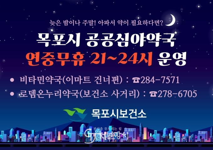 현재 목포시는 공공심야약국 2개소를 지정·운영하고 있다. 이마트 인근의 ‘비타민약국’(옥암동)은 2021년부터, 보건소 사거리 인근의 ‘로뎀온누리약국’(산정동)은 2023년부터 공공심야약국으로 지정돼 심야시간대 의약품 제공과 전문적인 복약지도를 실시하고 있다.