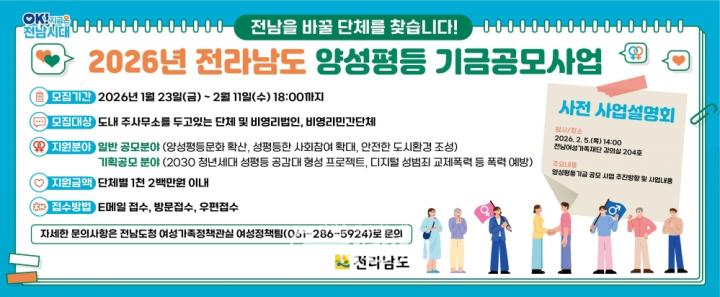 유미자 전남도 여성가족정책관은 “이번 공모사업은 예산 규모 확대와 기획공모 분야 신설을 통해 양성평등 정책이 현장에 보다 촘촘히 안착하도록 설계됐다. 청년 세대와 디지털 환경 등 새로운 정책 수요에 대응하는 사업이 발굴·확산되도록 적극 지원하겠다.”고 했다.