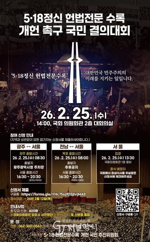 광주광역시(시장 강기정)는 전국 시민사회단체, 종교계, 오월단체, 광주시, 전남도 등으로 구성된 ‘5·18 헌법전문 수록 개헌 국민추진위원회’(이하 추진위원회)가 오는 25일 오후 2시 국회 의원회관 2층 대회의실에서 ‘5·18정신 헌법전문 수록 개헌 촉구 국민결의대회’를 개최한다고 4일 밝혔다.