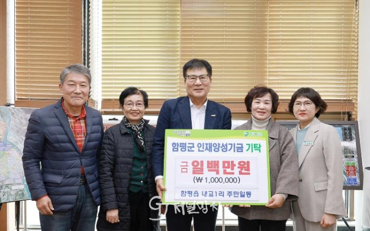 함평읍 내교1리 주민들도 마을공동체 활동으로 발생한 수익금 일부를 지역 학생들의 꿈을 응원하는 마음을 담아 인재양성기금으로 전달했다.