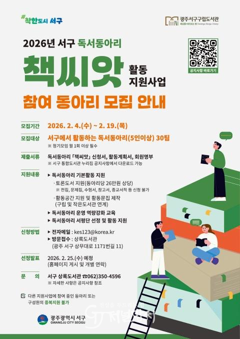 김이강 서구청장은 “주민들이 함께 읽고 함께 나누는 생활 독서가 일상에 자리 잡을 수 있도록 독서동아리 ‘책씨앗’ 사업을 지속적으로 추진하겠다 올해도 많은 독서동아리가 적극 참여해 주길 바란다.”고 했다.