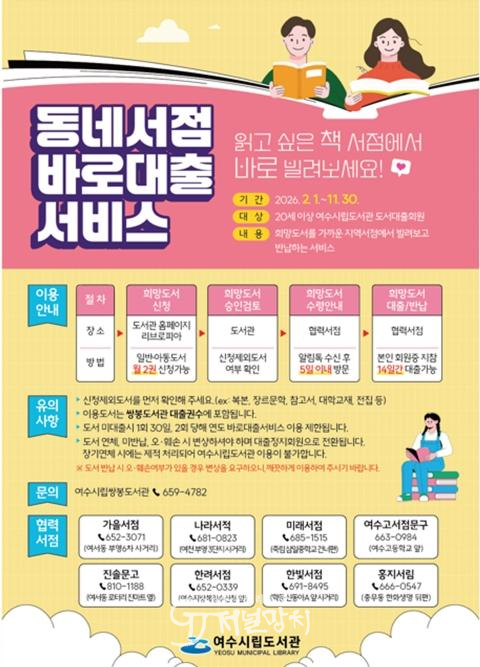 ‘동네서점바로대출서비스’는 20세 이상 여수시립도서관 도서대출회원을 대상으로 도서관을 직접 방문하지 않고도 협약된 가까운 동네서점에서 원하는 책을 바로 대출할 수 있는 서비스다.