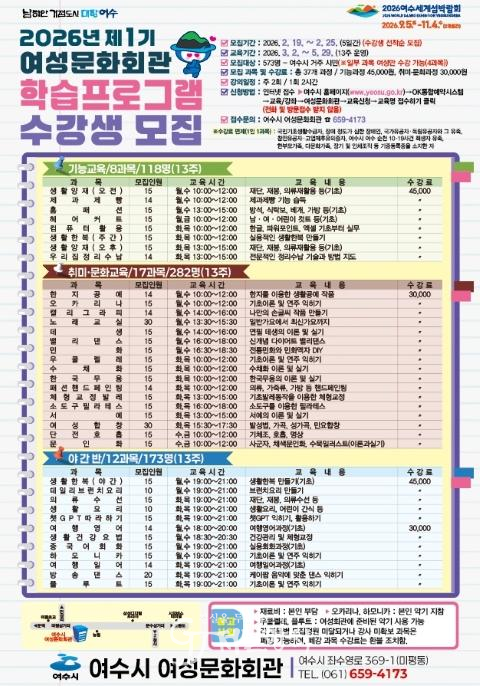 모집인원은 573명으로 교육 기간은 3월 2일부터 5월 29일까지다. 여수시에 거주하는 시민은 누구나 1인당 2과목까지 신청할 수 있으며 여수시 누리집 ‘OK통합예약시스템’ 내 교육/강좌에서 여성문화회관 교육을 신청하면 된다.