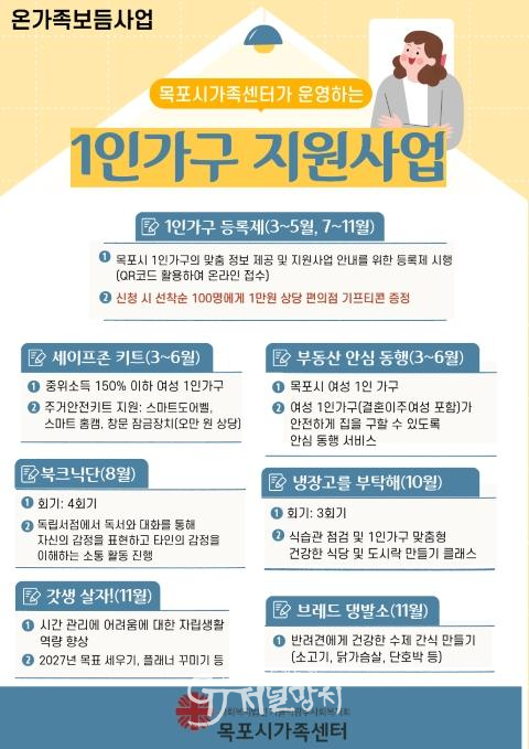 한편, 목포시가족센터는 찾아가는 상담소 운영 등 현장 중심 홍보를 병행해 1인가구의 참여 접근성을 높일 방침이다. 1인가구 등록 및 프로그램 신청 문의는 목포시가족센터 1인가구 지원사업 담당(061-247-2311)으로 하면 된다.