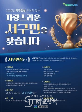 고진희 행정지원과장은 “서구민상은 보이지 않는 자리에서 묵묵히 지역을 위해 헌신해 온 분들을 기리는 상”이라며 “주민 여러분의 적극적인 관심과 추천을 바란다.”고 했다.