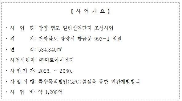 본 사업은 광양시 황금동·초남리 일원 534,340㎡ 부지에 총사업비 약 1,200억 원을 투입하여 2030년까지 조성하는 민간개발(SPC) 방식의 일반산업단지이다. 산업시설용지 63.8%, 녹지 및 공공시설 34.4% 등을 계획하고 있으며, 제조업·폐기물 수집, 운반, 처리 및 원료재생업·운수창고업 등이 배치될 예정이다.