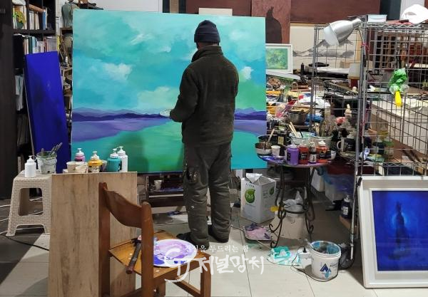 특히 아크릴 물감의 특성인 빠른 건조를 활용해 수차례 겹쳐낸 붓질은 파도의 구체적인 형태를 지우는 대신, 그 자리에 남은 고요함과 숨결을 강조한다. 하늘과 바다의 경계가 아득하게 흐려지는 표현 기법은 보는 이로 하여금 작가 개인의 기억을 넘어 관람객 각자의 내면 속 바다를 마주하게 한다.