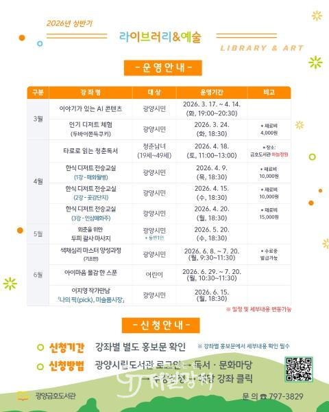 프로그램 신청은 강좌별 모집 일정에 따라 2월 23일 오전 10시부터 선착순으로 진행되며, 자세한 사항은 광양시립도서관 누리집에서 확인하거나 금호도서관(☎061-797-3829)으로 문의하면 안내받을 수 있다.